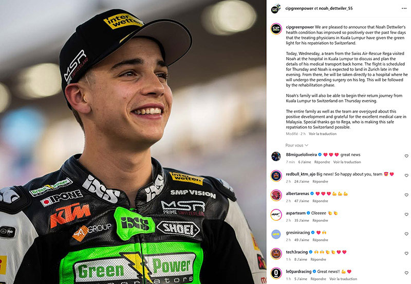 Voici une nouvelle mise à jour officielle, plutôt rassurante, publiée conjointement ce soir par le team CIP Green Power et le management du pilote suisse au sujet du pilote Noah Dettwiler, après son très sérieux accident survenu à Sepang, dans le cadre du championnat du monde Moto3.