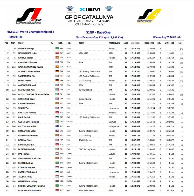 Marc-Reiner Schmidt, quant à lui, était déjà en sixième position, mais c’était tout ce que le leader du championnat pouvait faire. Thomas Chareyre a lui aussi dépassé Gaya et pointait désormais en quatrième position, mais la concurrence était trop éloignée pour plus de points dans cette course. Diogo Moreira a terminé la course en première position après douze tours, suivi par Lukas Hollbacher, arrivé 11.681s derrière. Le podium a été complété par Ferrán Cardús.