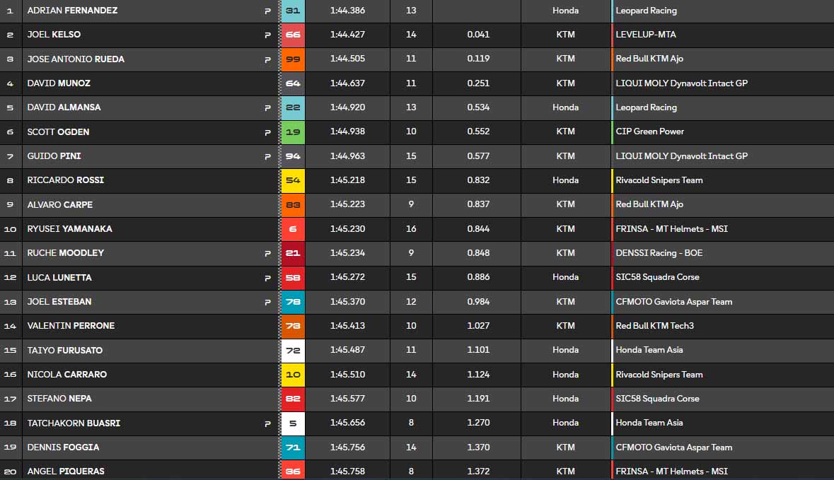Excellent chrono de Scott Ogden (KTM CIP Green Power), qui devra quand même passer par la Q1 pour la première fois cette année. Ruché Moodley (Red Bull KTM Tech3), le rookie Sud-Africain, est encore bien placé.