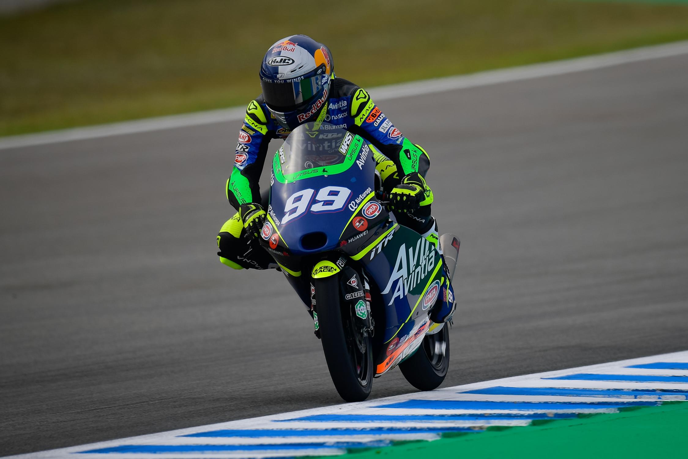 Tatsuki Suzuki (Honda, SIC58 Squadra Corse, #24) est abonné à la pole position à Jerez : l’an dernier déjà, il établissait ses deux dernières pôles sur ce tracé de Jerez, alors quoi de mieux ce samedi que de s’en offrir une nouvelle. À vrai dire, personne n’aura réussi à venir inquiéter le pilote Japonais lors du dernier run de ces qualifications, pas même Jeremy Alcoba (Honda, Team Gresini Moto3, #52), qui venait s’adjuger le deuxième chrono sur le fil. Andrea Migno (Honda, Rivacold Snipers Team, #16), auteur du record du tour lors de la FP3, se hissait à leurs côtés en première ligne.