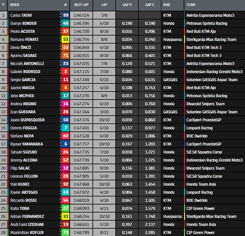 La deuxième ligne sera quant à elle occupée par Gabriel Rodrigo (Honda, Team Gresini Moto3, #2), Romano Fenati (Husqvarna, Sterilgarda Max Racing Team, #55) et John McPhee (Honda, Petronas Sprinta Racing, #17). Darryn Binder (KTM, Petronas Sprinta Racing, #40) s’est qualifié à la septième position, après un highside assez impressionnant. Ayumu Sasaki (KTM, Red Bull KTM Tech3, #71), Niccolò Antonelli (KTM, Reale Avintia, #23) et Deniz Öncü (KTM, Red Bull KTM Tech3, #53) complètent le Top 10.