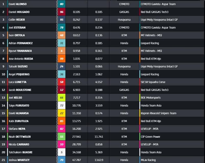 Mais les efforts de Riccardo Rossi tombent à l’eau ! Une chute aux S bleus l’élimine ! Il y a eu contact avec David Munoz, c’est évident, mais difficile d’attribuer la faute à l’un des deux larrons. Dans le même temps, Collin Veijer en profite pour trouver l’ouverture sur Holgado, et Munoz en profite aussi. Le pilote GasGas Tech3 ne se laisse pas faire, il n’a pas dit son dernier mot.