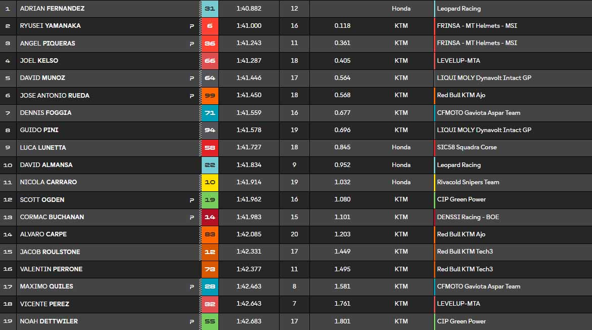 Finalement, Adrian Fernandez conclut cette première séance en tête devant Ryusei Yamanaka (KTM MT Helmets MSi) et Angel Piqueras. David Munoz (KTM Liqui Moly Intact GP) et José Antonio Rueda complètent le top 5.