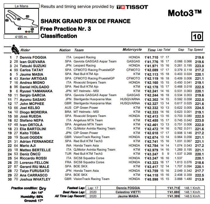 Classement de la FP3 du Grand Prix de France Moto3 su le circuit du Mans :