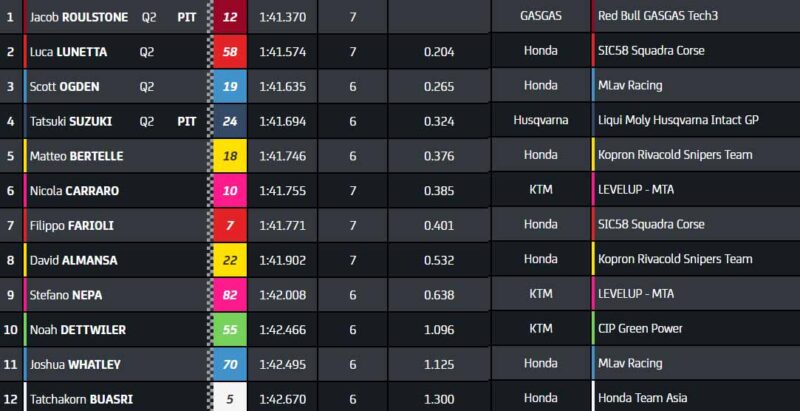 L’Australien Jacob Roulstone finit premier de cette Q1, juste devant Luca Lunetta et Scott Ogden. Tatsuki Suzuki complète le top 4, qui laisse Matteo Bertelle sur le carreau. Déception également pour Filippo Farioli, qui n’avait manqué jamais manqué la Q2 depuis le GP du Qatar l’an passé.