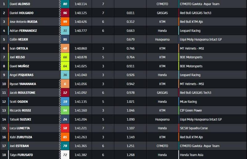 Du coup, David Alonso réalise sa troisième pole consécutive avec un nouveau record, mais Daniel Holgado n’a pas démérité. Il ne termine qu’à 11 millièmes de seconde. José Antonio Rueda, bien remis de son appendicite, est troisième, alors qu’Adrian Fernandez (Honda Leopard Racing) est la première Honda sur la grille en quatrième place. Petite déception pour son coéquipier rookie Angel Piqueras, qui a chuté dans les derniers instants.
