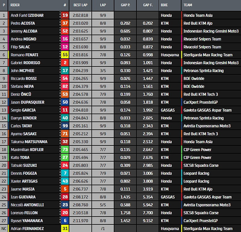 Filip Salac (Rivacold Snipers Team), tombé sur la fin du circuit, emmènera pour sa part la troisième rangée. Sergio Garcia (Gaviota GASGAS Aspar Team) et Tatsuki Suzuki (SIC58 Squadra Corse) seront installés à ses côtés, tandis que Romano Fenati (Sterilgarda Max Racing Team) complètera le Top 10.
