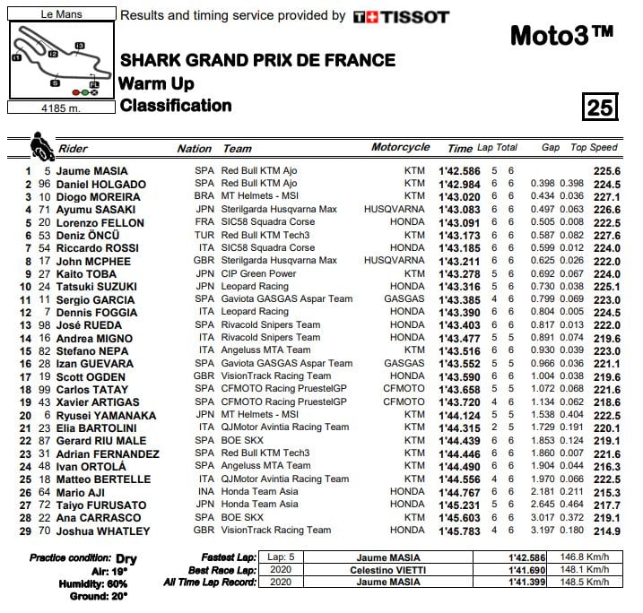 Classement du Warm Up du Grand Prix de France Moto3 su le circuit du Mans :