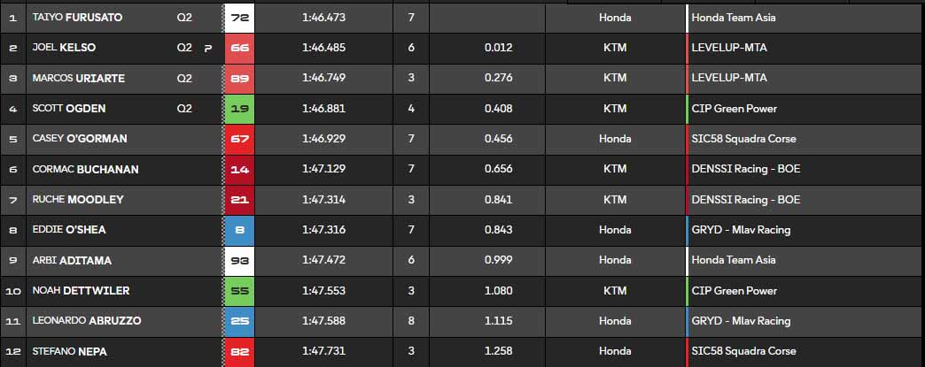 Marcos Uriarte (KTM Levelup MTA) est le premier à inscrire un temps significatif. Mais Furusato fait mieux, très rapidement. Finalement, Furusato termine premier de cette séance, et sera rejoint en Q2 par Joel Kelso, Marcos Uriarte et Scott Ogden.