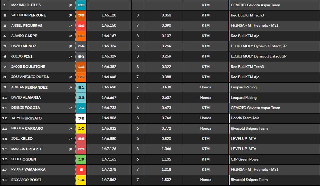 Mais l’intenable Maximo Quiles ne fait qu’améliorer ses secteurs, et passe ainsi premier au classement provisoire. Le rookie est impressionnant. Une chute est à noter : celle de Furusato, qui revenait de la Q1. Quiles est désormais le seul en 1’45.