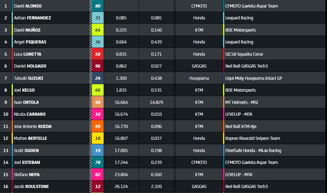 Menaçant depuis quelques tours, Adrian Fernandez prend le commandement, mais Veijer ne se laisse pas faire. On note une double chute, de Filippo Farioli (Honda Sic58 Squadra Corse) et David Almansa (Honda Snipers Team). David Alonso, lui, quatrième, rôde. Daniel Holgado commet une petite erreur qui le voit glisser en neuvième place. L’Espagnol est tout de même très rapide et a entamé une remontée depuis la 14e place sur la grille.