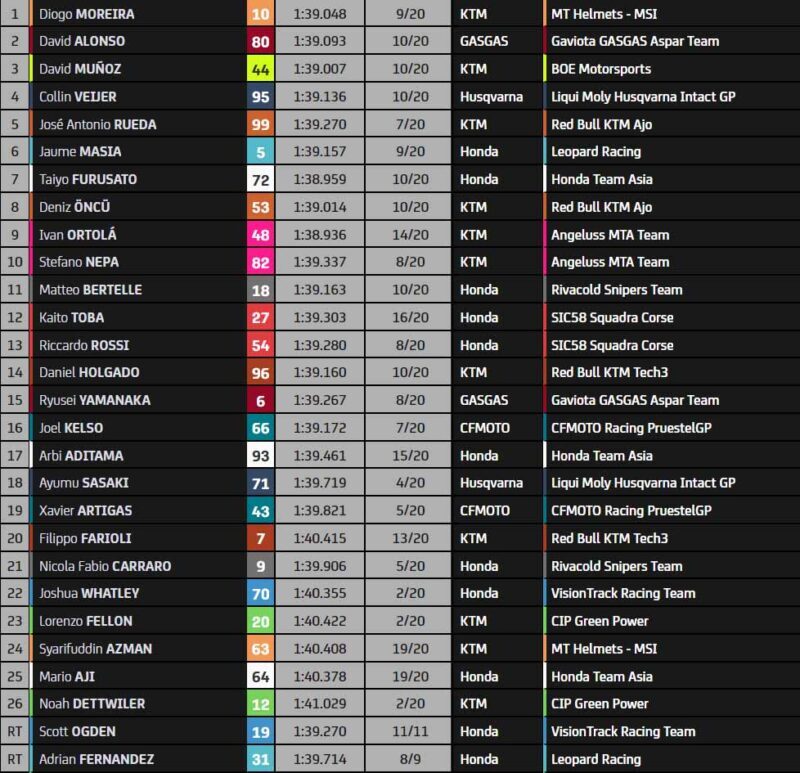 Et c’est finalement Diogo Moreira qui remporte cette course de folie ! Quel final ! David Alonso est deuxième, tandis que David Muñoz est troisième.Il devient le premier brésilien vainqueur depuis Alex Barros en 2005. Au championnat, Jaume Masiá mène de 16 points devant Ayumu Sasaki, alors que Daniel Holgado a écopé de trois secondes de pénalité en raison d’un deuxième long lap non respecté.