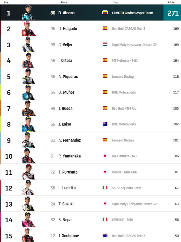 Avec 82 points d’avance, le Colombien mène largement le championnat, et désormais rien ne semble vraiment pouvoir l’empêcher de filer vers le titre mondial. Mais rien n’est jamais joué d’avance, et Daniel Holgado (Red Bull GasGas Tech3), deuxième au classement général et véloce à Misano, va donc devoir se retrousser les manches, tout comme Ivan Ortola (KTM MT Helmets MSi) et Collin Veijer (Liqui Moly Husqvarna Intact GP), les autres protagonistes de cette saison…