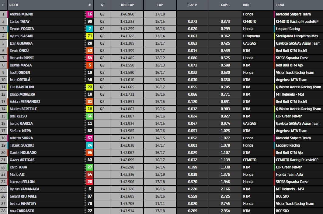 A 9min du finish, le top14 provisoire en vue de la Q2 se compose de : Foggia, Migno, Sasaki, Suzuki, Moreira, Oncu, Abi, Masia, Tatay, Artigas, Kelso, Guevara, Holgado et Toba.