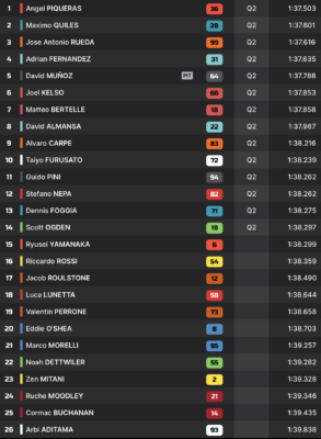 Angel Piqueras profite de cet incident pour se promouvoir aux avant-postes, avec un temps en 1:37.503. Derrière lui, un peloton compact, dans lequel tous les favoris pour la victoire se qualifient en Q2.