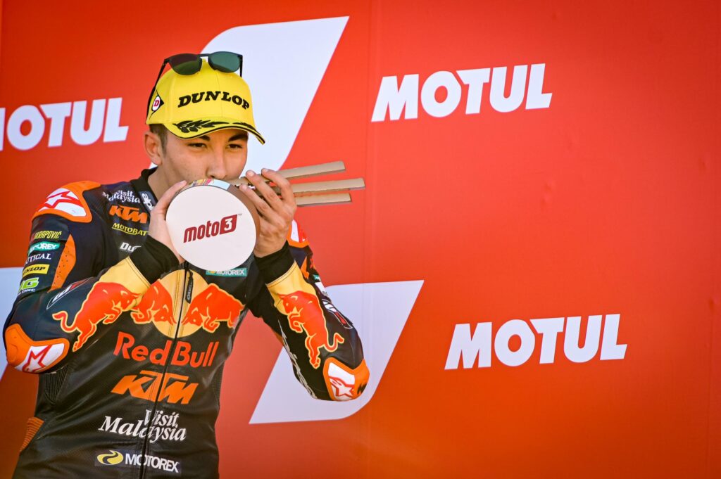 « Depuis que je suis petit, je rêve de ça, entrer dans le cercle des vainqueurs et être en MotoGP. J’espère que je pourrai y parvenir avec KTM, car ce serait quelque chose de fantastique, et que Miguel Oliveira et Brad Binder ont déjà fait, également depuis la Rookies Cup. »