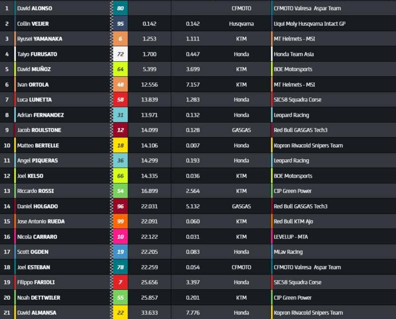 David Alonso prend ainsi sa troisième victoire consécutive, et la cinquième de la saison. Collin Veijer ne démérite pas, après trois tours de folie sur la fin, et prend une belle option au championnat. Ivan Ortola est parvenu à remonter sur sa machine pour finir sixième, afin de sauver les meubles. Daniel Holgado, en déroute, marque quand même deux points importants, même si Alonso s’est désormais envolé au championnat. Après un beau début de saison, Ryusei Yamanaka prend ici son premier podium en carrière ! Bravo à lui.