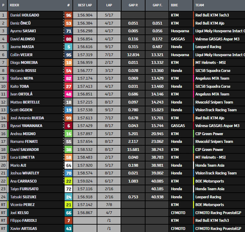 Masia passe en tête mais est repris par Holgado très rapide. Oncu, Sasaki, Alonso, Furusato, Rossi, Rueda et Bertelle viennent compléter ce top10 à 14 tours du but. Oncu reprend les rênes bien décider à décrocher sa 1ère victoire