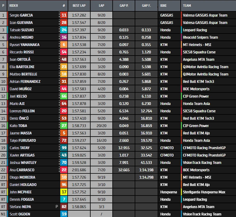 Izan Guevara (GasGas, GasGas Aspar Team, #28) est rétrogradé d’une position pour avoir dépassé les limites de la piste dans le dernier tour, il perd le bénéfice de la victoire qu’il offre donc à son coéquipier, Sergio Garcia (GasGas, GasGas Aspar Team, #11). Lorenzo Fellon (Honda, SIC58 Squadra Corse, #20) termine 14e et rentre dans les points.