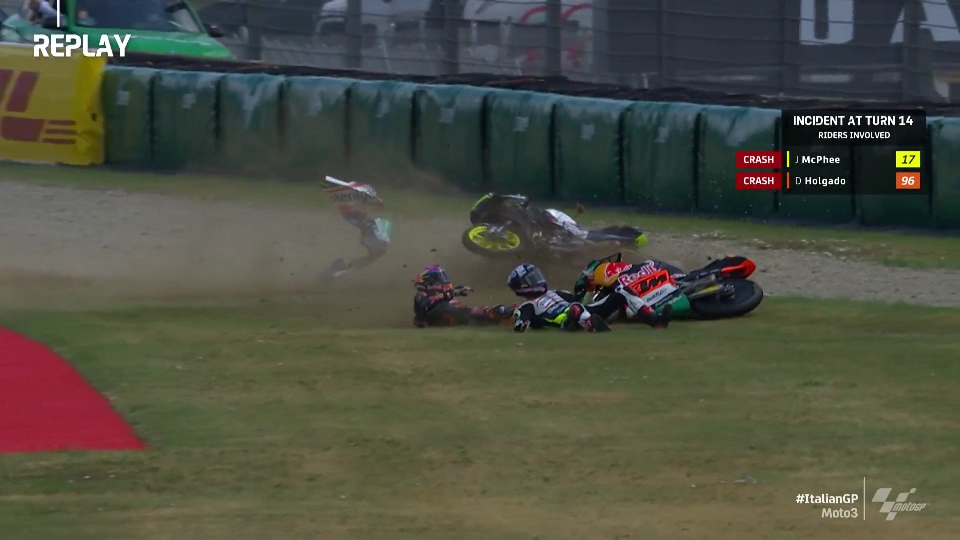 Race leader @dennisfoggia71 goes down, @carlostatay99 takes avoiding action with @Denizoncu53 separate incident and @johnmcp17, Daniel Holgado crashing together! 💥#Moto3 | #ItalianGP 🇮🇹 pic.twitter.com/0BfORf4f6S