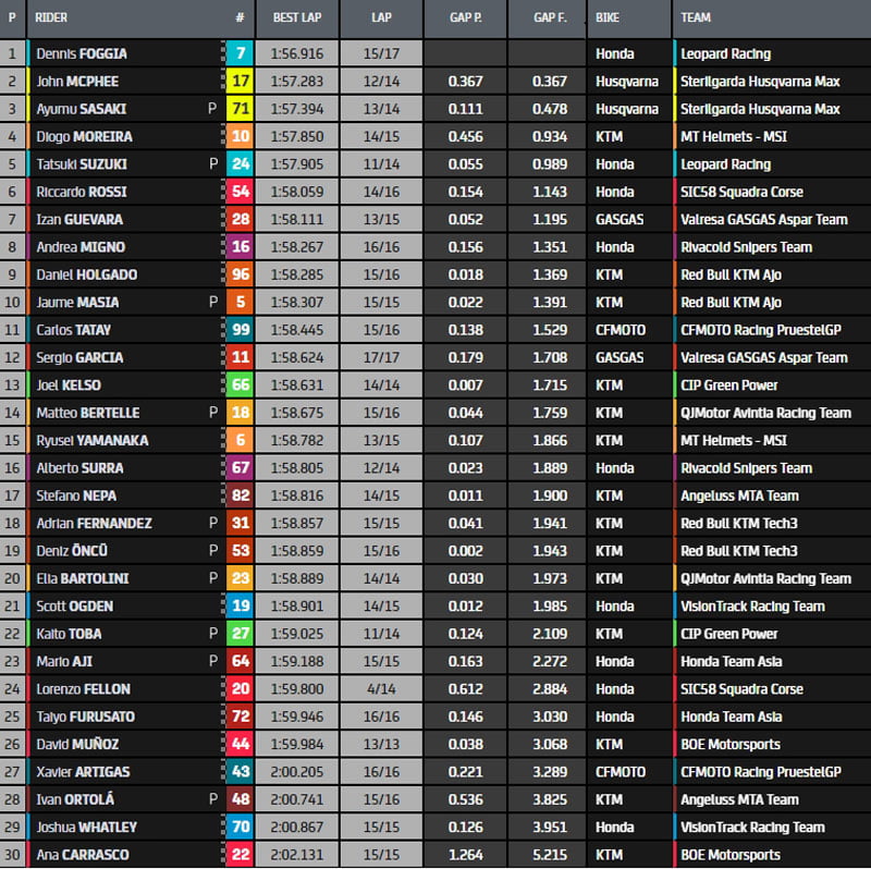 A l’issue de cette FP1 très disputée, Dennis Foggia (Honda, Leopard Racing, #7) est le plus rapide, en 1’56.916, devant le duo Sterilgarda Husqvarna Max, mené par John McPhee à 0.367s et Ayumu Sasaki à 0.478s. Kaito Toba (KTM, CIP-Green Power, #27) chute au virage 10 en toute fin de séance.