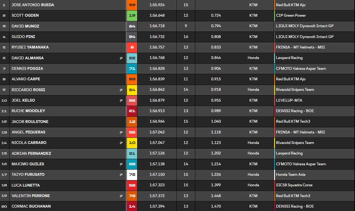 David Almansa (Honda Leopard Racing) se réveille, tout comme ses concurrents. Tout le monde améliore, mais Rueda reste seul, en tête, assez loin devant ses poursuivants. La domination continue. Scott Ogden (KTM CIP Green Power) est deuxième, devant le duo KTM Intact GP composé de David Munoz et Guido Pini. Ryusei Yamanaka (KTM MT Helmets MSi) complète le top 5.