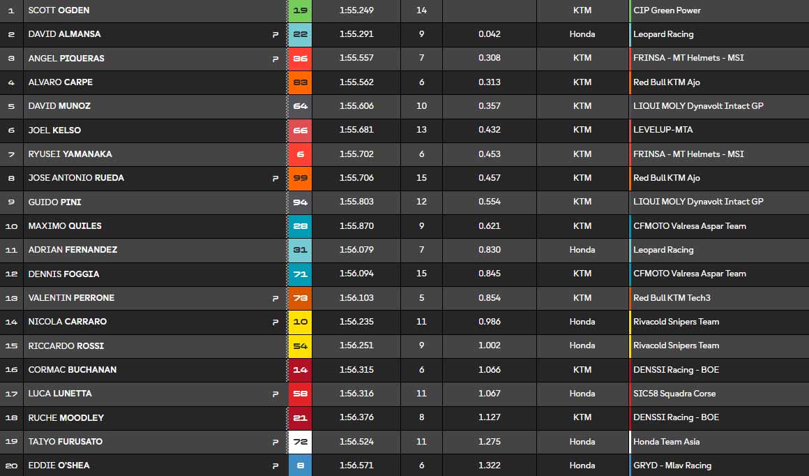 Au chrono, les deux premiers à s’illustrer sont les deux rookies du moment : Maximo Quiles et Alvaro Carpe, suivis de José Antonio Rueda. Mais juste après, l’autre rookie Guido Pini (KTM Liqui Moly Intact GP) prend le commandement des opérations, lui qui devra passer par la Q1. Cependant, ça devrait rouler plus vite.