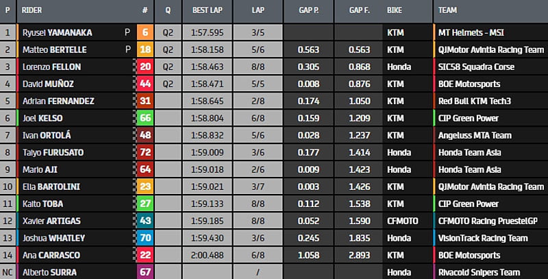 A l’issue de cette Q1, Ryusei Yamanaka (KTM, MT Helmets – MSI, #6) n’améliore pas mais reste leader en 1’57.595, il se qualifie avec Matteo Bertelle (KTM, QJMotor Avintia Racing Team, #18) qui a 0.563s de retard, Lorenzo Fellon (Honda, SIC58 Squadra Corse, #20) qui réalise un excellent dernier tour et David Muñoz (KTM, BOE SKX, #44).