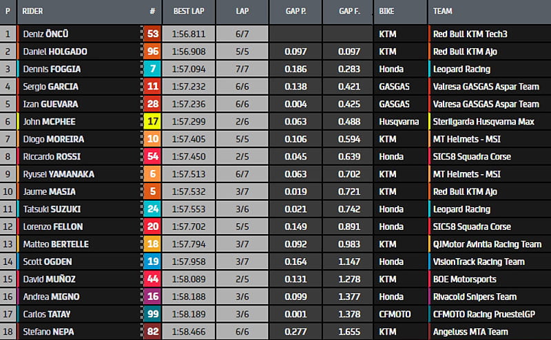 Finalement, le plus rapide restera Deniz Öncü (KTM, Red Bull KTM Tech3, #53), qui partira de la pole position, devant Daniel Holgado (KTM, Red Bull KTM Ajo, #96) et Dennis Foggia (Honda, Leopard Racing, #7). Lorenzo Fellon (Honda, SIC58 Squadra Corse, #20) partira 12e.