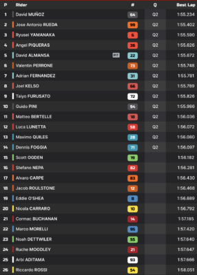David Munoz et Jose Antonio Rueda en profitent pour prendre les commandes au marquoir. Ils le resteront jusque devant le drapeau à damier, pour assurer leur qualification. Ryusei Yamanaka chute lui aussi en milieu de FP. Il fut emmené au centre médical, avant d’être déclaré apte à poursuivre. Remonté sur sa machine, il signe le 3e chrono final et parvient à se qualifier. Maximo Quiles et Dennis Foggia se qualifient de justesse, avec les 13e et 14e rangs de cette FP Moto3 à Motegi.
