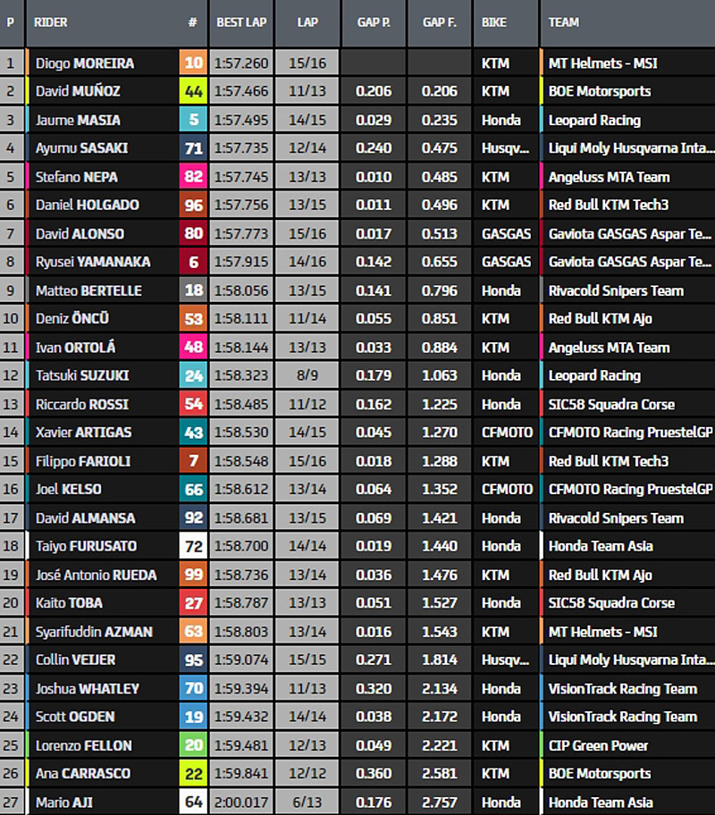 À la mi séance, le top cinq est constitué de Jaume Masia, David Munoz, Deniz Öncü (Red Bull KTM Ajo), Diogo Moreira (MT Helmets – MSI) et Daniel Holgado (Red Bull KTM Tech3).