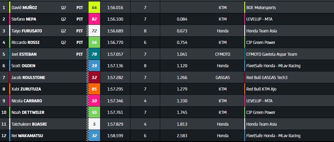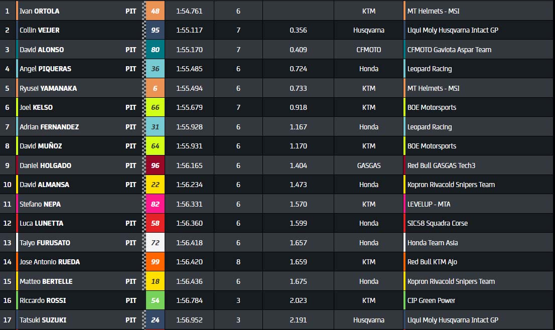 Finalement, David Munoz reprend sa première position et conclut cette Q1 en tête. Stefano Nepa est deuxième, juste devant Taiyo Furusato et Riccardo Rossi (KTM CIP Green Power). Joel Esteban (CFMoto Aspar Team) est le premier des éliminés.