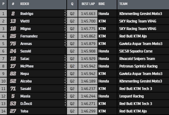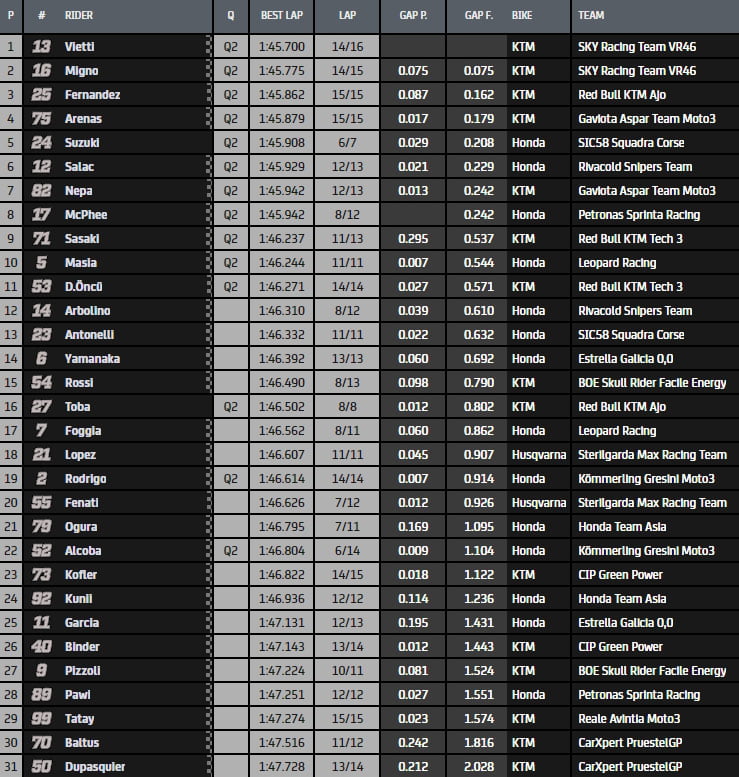 Vietti terminait finalement premier cette troisième séance d’essais libres, mais au classement confondu Rodrigo restait leader devant Vietti, Migno, Fernández, Arenas, Suzuki, Salač et McPhee. Antonelli ne parvenait pas à se qualifier.