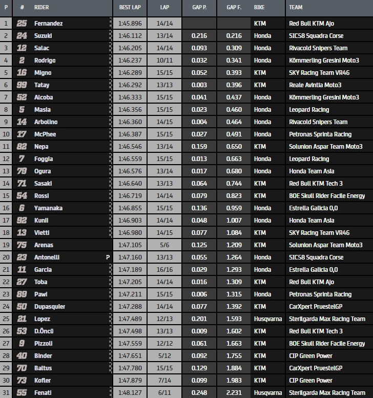 Au final, le meilleur temps revenait à Raúl Fernández (Red Bull KTM Ajo) en 1’45.896 Tatsuki Suzuki, Filip Salač, Gabriel Rodrigo et Andrea Migno.