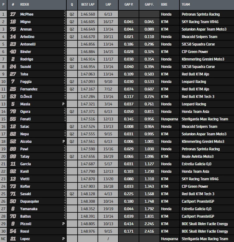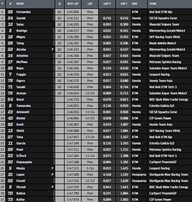 McPhee conservait le commandement en améliorant son chrono en 1’46.560. Son avance était de 0.6 sur Rodrigo et Fernández, puis de 0.7 sur Masiá, Antonelli et Suzuki. Fernández remontait la première KTM en deuxième position.