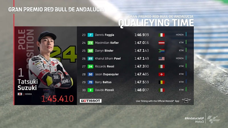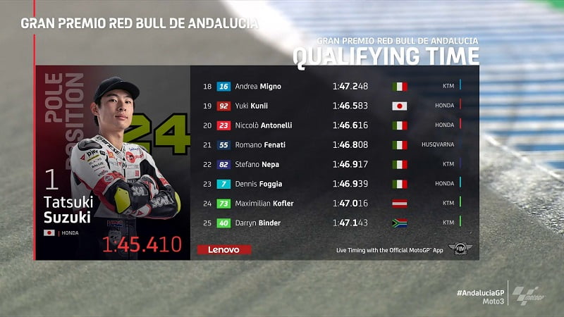 La pole position revenait finalement à Suzuki en 1’45.410, devant Ogura, Rodrigo, Fernández, Arbolino et Arenas.