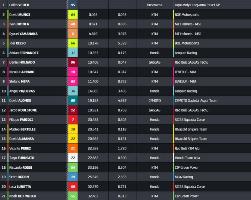 Munoz ne parvient pas à réaliser de manœuvre géniale, ce qui conduit à la victoire de Collin Veijer pour seulement 45 millièmes de secondes ! Ivan Ortola est troisième. Joel Esteban, le rookie d’Aspar Martinez, chute dans le dernier virage ! Terrible pour lui, qui aurait pu s’assurer son premier top 6. Ryusei Yamanaka et Joel Kelso s’assurent, respectivement, les 5e et 6e places.