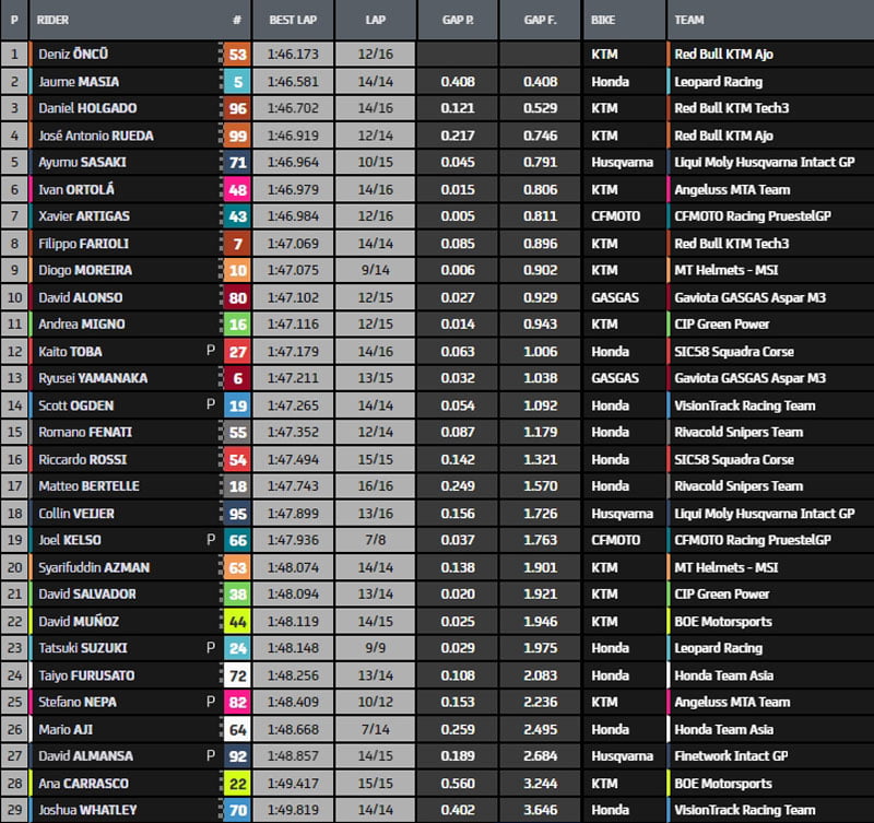 Deniz Öncü, confortable leader, reste en tête jusqu’à la fin. Jaume Masiá (Honda Leopard Racing) est l’auteur d’une bonne séance, revient deuxième à la toute fin. Une petite chute à signaler, celle de David Almansa (Husqvarna Finetwork Intact GP) dans les tous derniers instants. Daniel Holgado finit troisième.