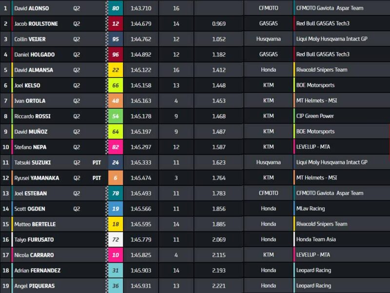 À 12 minutes de la fin, David Alonso se réveille et enregistre un tout petit 1’45. Collin Veijer (Liqui Moly Husqvarna Intact GP), assez discret jusqu’à maintenant en comparaison de sa saison passée, est deuxième. Daniel Holgado, assez loin ce matin, peine à se rapprocher des meilleurs. La session est très calme, exactement comme ce matin : toujours aucune chute.