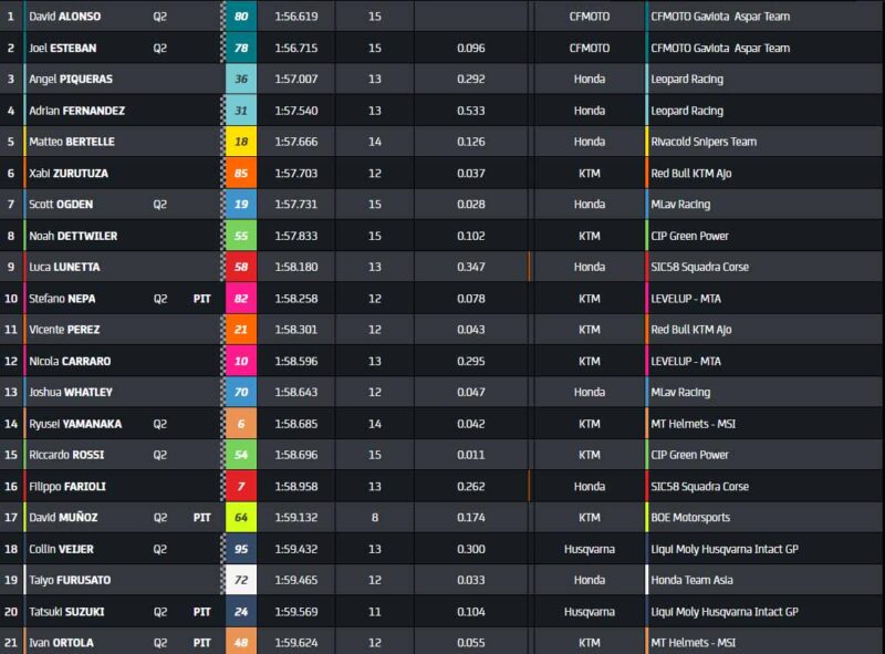 Belle performance du rookie Joel Esteban (CFMoto Aspar Moto3), ainsi que d’Angel Piqueras. Les qualifications promettent d’être très disputées, à n’en pas douter.