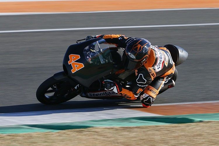 Aron Canet a disputé toutes ses courses de Championnat du Monde Moto3 sur une Honda. A présent, le voilà sur une KTM. Aux essais de Valence, il a roulé 0,2 seconde en dessous du record du tour en 1’ 39.109 min. Autant dire que son adaptation à la machine autrichienne s’est faite sans difficulté.