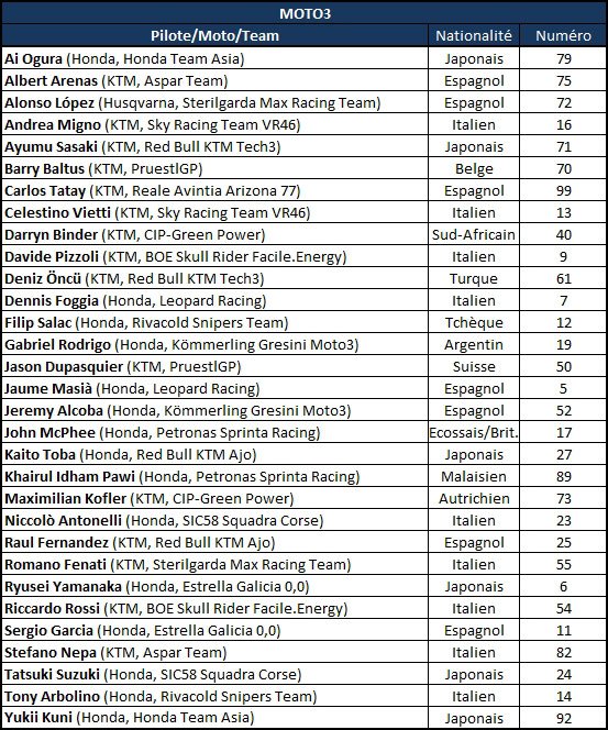 Enfin, on suivra avec attention les premiers pas des titulaires du team Carxpert Prüstel GP, le Suisse Jason Dupasquier et le belge Barry Baltus, ce dernier, trop jeune, étant provisoirement remplacé par Dirk Geiger, mais aussi de Jeremy Alcoba (Honda, Kömmerling Gresini Moto3), Carlos Tatay (Reale Avintia Arizona 77), Champion en titre de la Red Bull MotoGP Rookies Cup, Ryusei Yamanaka (Estrella Galicia 0,0), et Yuki Kunii (Honda Team Asia)
