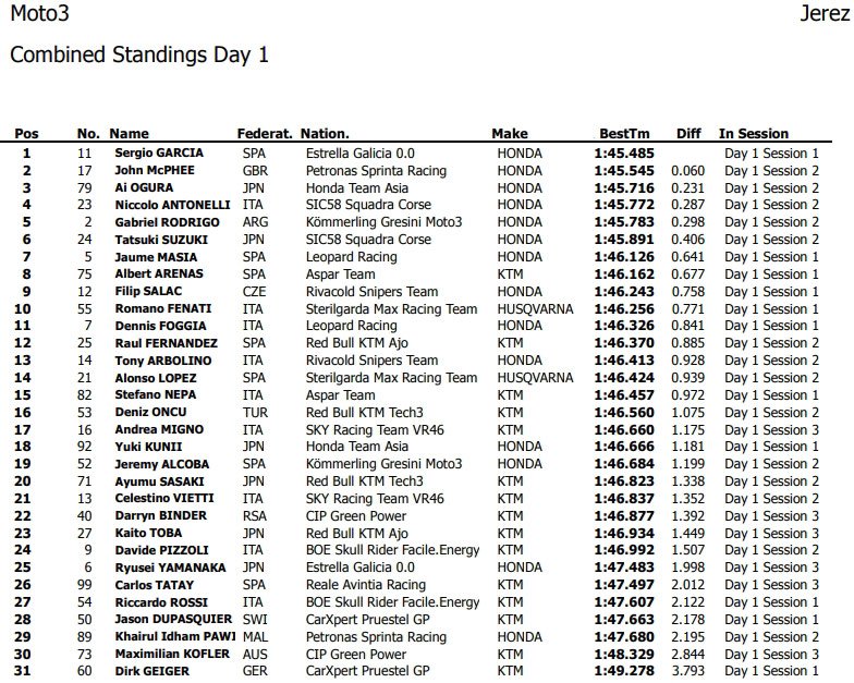 John McPhee (Petronas Sprinta Racing), Jaume Masiá (Leopard Racing) et Albert Arenas (Aspar Team) complétaient alors le Top 5 de ce premier jet.