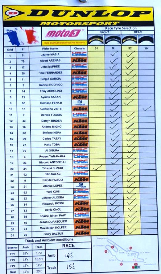 Au départ de ce Grand Prix de France, volonté machiavélique des dieux de la course ou pas, on retrouve les deux protagonistes de la chute de Barcelone, Albert Arenas et John McPhee sur la première ligne, derrière le poleman et nouveau recordman de la piste Jaume Masià (Honda, Leopard Racing) : pas question de se rater la chicane Dunlop !