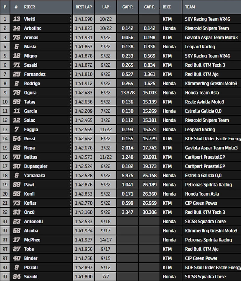Au championnat, Albert Arenas mène maintenant de 6 points devant Ai Ogura qui sauve les meubles, 16 sur Celestino Vietti et 20 sur Tony Arbolino.