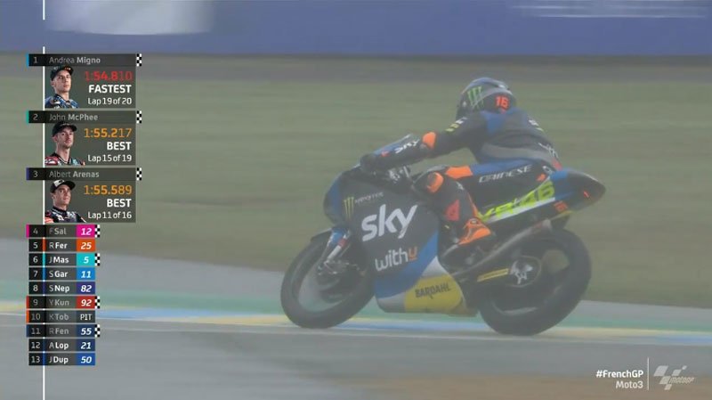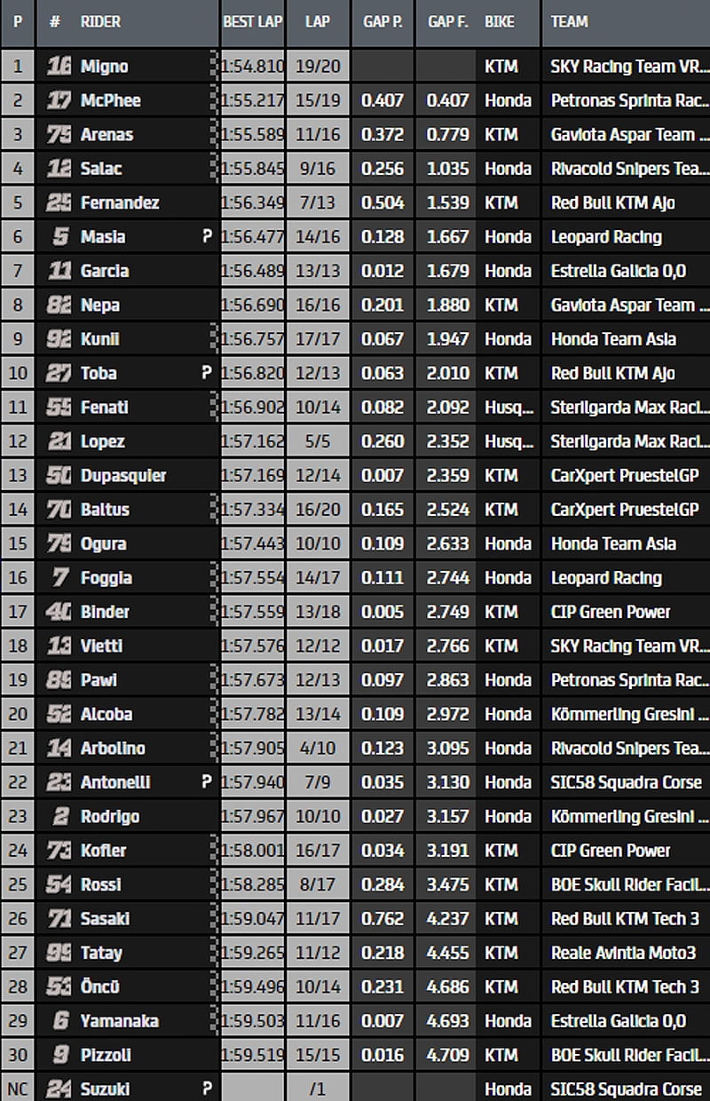 Andrea Migno (KTM, Sky Racing Team VR46) semble particulièrement à l’aise dans ces conditions très précaires et s’empare du leadership en 1’55.432 alors que Ai Ogura (Honda, Honda Team Asia) part au sol à la chicane Dunlop.