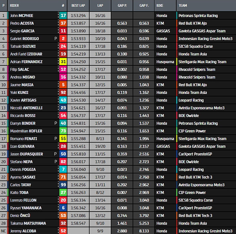 Au final, c’est John McPhee (Honda, Petronas Sprinta Racing, #17) qui s’en tire le mieux dans ces conditions compliquées, en 1’53.294, devant Pedro Acosta (KTM, Red Bull KTM Ajo, #37) et Sergio Garcia (GasGas, Aspar Team Moto3, #11).