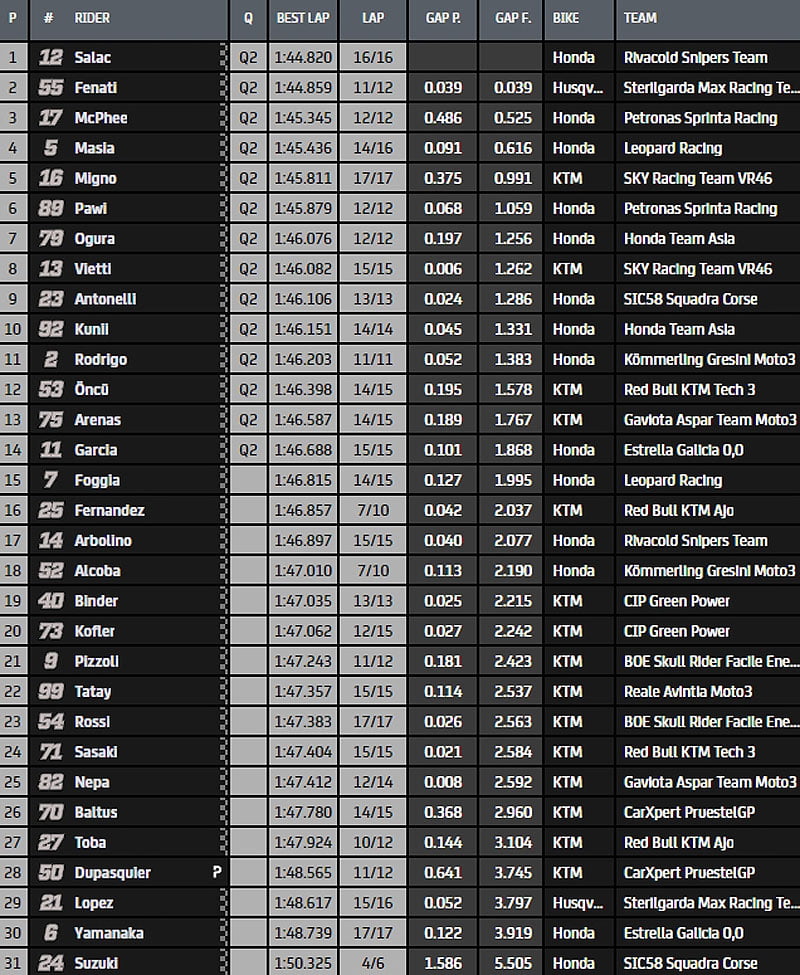 Fenati claque un 1’45.273. Mais entre dans la zone des 1’44 en vue du drapeau à damier. Sous ce dernier, c’est Salac qui se montre le plus véloce en 1’44.820, devant Fenati, battu pour 39 millièmes, McPhee, Masia et Migno. Pawi mène le reste de la meute.