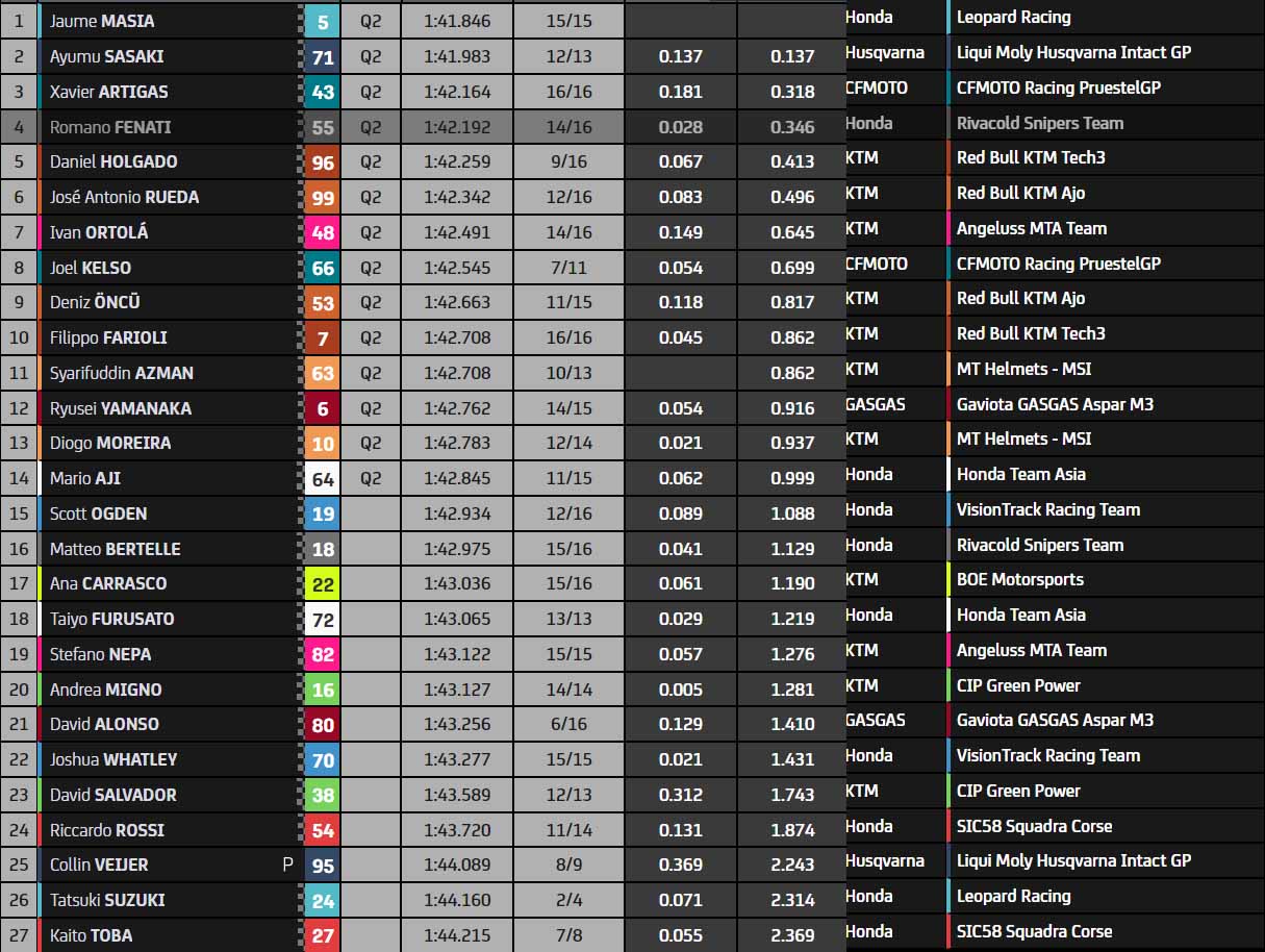 Le rookie José Antonio Rueda (Red Bull KTM Ajo), relativement discret depuis le début de saison, s’empare brièvement de la deuxième position. Petite erreur de Syarifuddin Azman (KTM MT Helmets MSI) dans la Chicane Dunlop, alors qu’Ayumu Sasaki reprend la tête du classement provisoire, jusqu’à ce que Jaume Masiá le rattrape dans les dernières secondes !