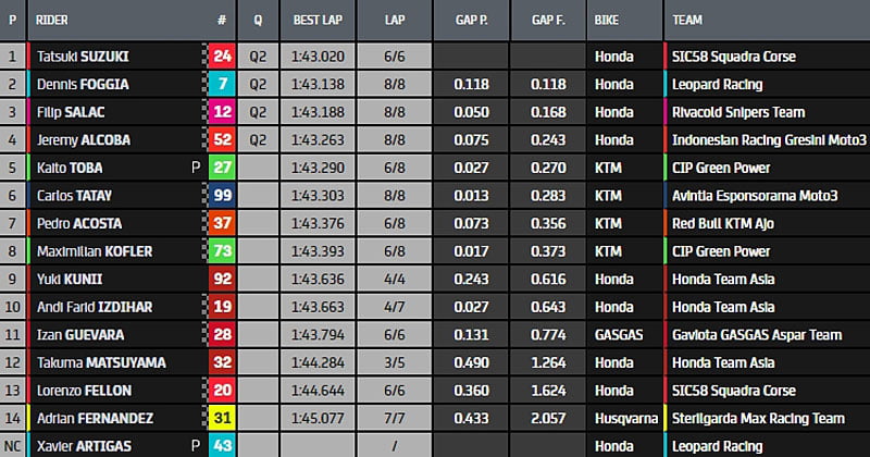 Les chronos s’améliorent à chaque tour, et à la fin de cette Q1, c’est Tatsuki Suzuki (Honda, SIC58 Squadra Corse, #24) qu iréalise le meilleur chrono en 1’43.020, et passe en Q2 avec Dennis Foggia (Honda, Leopard Racing, #7), Filip Salac (Honda, Rivacold Snipers Team, #12) et Jeremy Alcoba (Honda, Team Gresini Moto3, #52).
